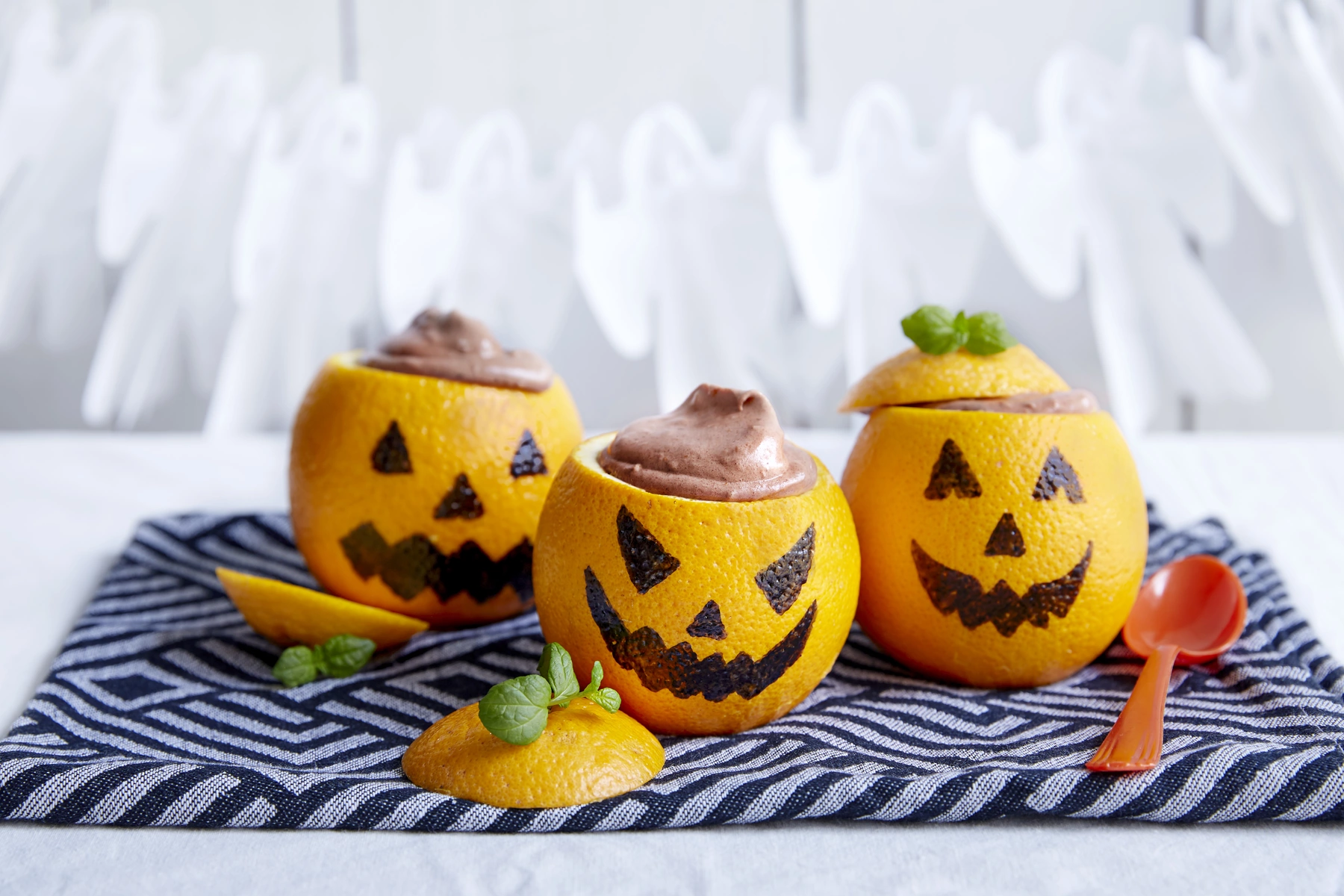 La barna pynte appelsinene ved å tegne gresskaransikter med tusj (sprittusj gir best resultat) – kan droppes dersom man vil servere dette utenom Halloween.
