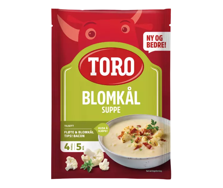 Vegetarisk : Plantebasert kosthold/rett som kan inneholde meieriprodukter TORO Blomkålsuppe er en klassisk kremet blomkålsuppe med mild smak og biter av blomkål. Tilberedes med fløte og blomkål, og topp gjerne med sprøstekt bacon.
