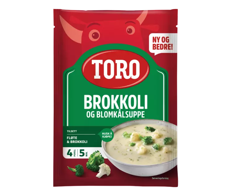 Vegetarisk : Plantebasert kosthold/rett som kan inneholde meieriprodukter TORO Brokkoli- og Blomkålsuppe er en kremet suppe med biter av blomkål og brokkoli. Tilberedes med brokkoli og fløte.