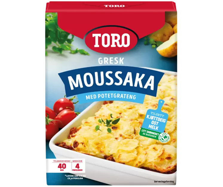 Vegetarisk : Plantebasert kosthold/rett som kan inneholde meieriprodukter TORO Gresk Moussaka er basert på nasjonalretten fra det greske kjøkken og er perfekt for hele familien. TORO Gresk moussaka kommer med sausmiks til kjøttdeig og hvit saus samt potetskiver. Server gjerne med en gresk salat med fetaost og oliven. Lett å like, lett å lage.