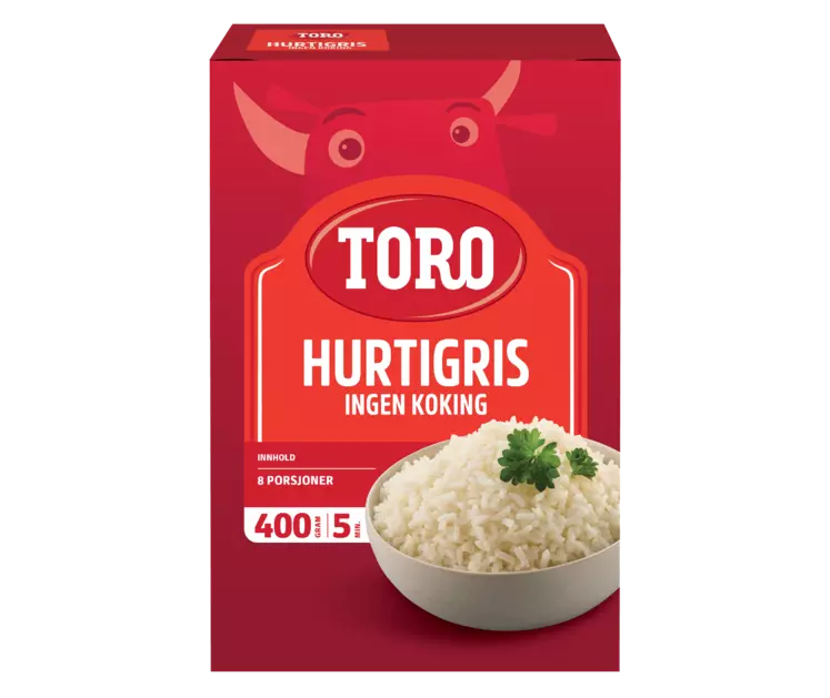 Vegetarisk : Plantebasert kosthold/rett som kan inneholde meieriprodukter, egg og honning, samt ingredienser med opprinnelse i disse. TORO Hurtigris er en hvit, luftig og langkornet ris med mild smak. Risen er forkokt og tørket. Behandlingen sørger for et næringsrikt og velsmakende produkt som tilberedes på kun 5 minutter. TORO Hurtigris passer godt til alle type retter.