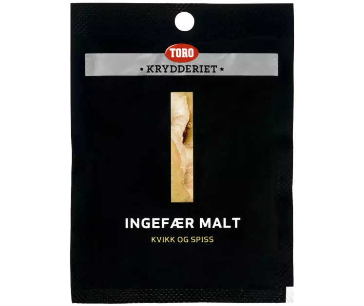 Vegetarisk : Plantebasert kosthold/rett som kan inneholde meieriprodukter, egg og honning, samt ingredienser med opprinnelse i disse. Ingefær er et aromatisk krydder med karakteristisk smak, som er godt kjent fra det asiatiske kjøkken. TORO Krydderiet Malt ingefær passer godt i marinader for svin, kylling og and. Krydderet er også mye brukt i bakverk, pepperkaker, ingefærnøtter, honning kake, og krydderkaker. Lett å like, lett å lage.