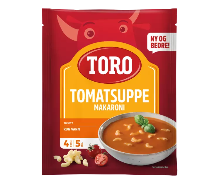 Vegetarisk : Plantebasert kosthold/rett som kan inneholde meieriprodukter TORO Original Tomatsuppe med makaroni er hele Norges favoritt. Det er en mild suppe med en barnevennlig smak som har definert hvordan en tomatsuppe skal smake i Norge. Tilbehør som egg og varme rundstykker smaker ekstra godt til.
