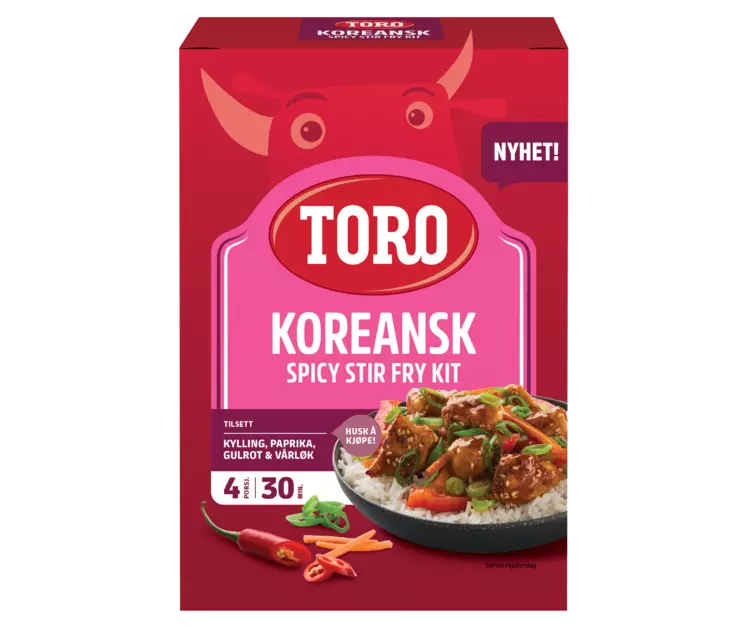Vegetarisk : Plantebasert kosthold/rett som kan inneholde meieriprodukter TORO Koreansk Stir Fry er en smakfull rett med spennende koreanske smaker. KITet inneholder jasminris, kryddermarinade og miks for saus. Tilberedes med kylling, paprika, gulrot og vårløk. Perfekt for å lykkes med asiatisk mat i hverdagen!