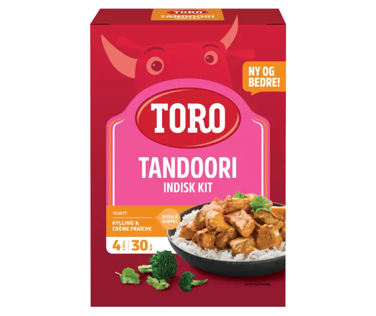 TORO KIT Tandoori er en mildt krydret, kremet indisk kyllingrett med spisskummen, hvitløk og ingefær. KITet inneholder basmatiris, kryddermarinade og miks for saus. Tilberedes med kylling og crème fraîche. Perfekt for å lykkes med asiatisk mat i hverdagen!