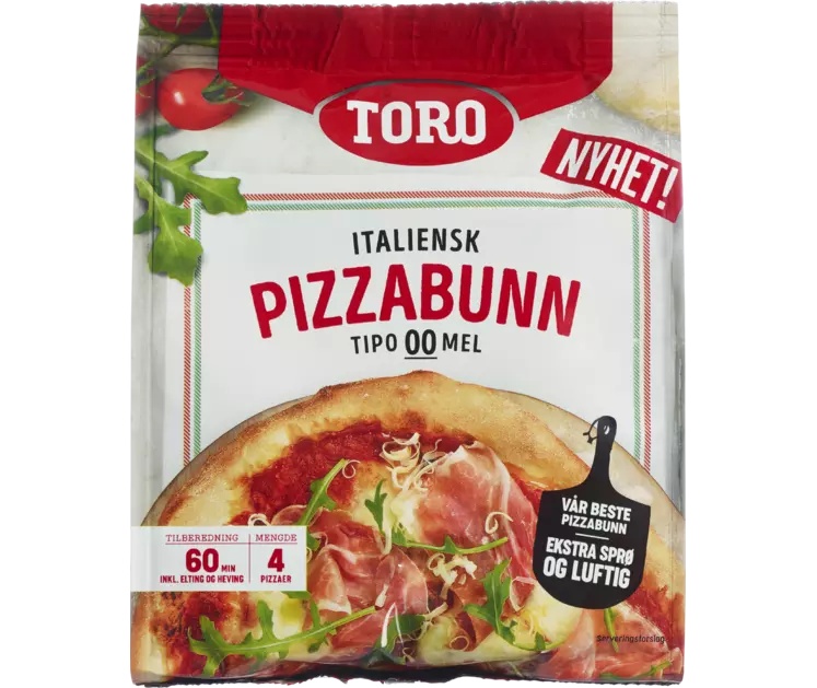 Vegetarisk : Plantebasert kosthold/rett som kan inneholde meieriprodukter, egg og honning, samt ingredienser med opprinnelse i disse. TORO Pizzabunn Italiensk er laget av Tipo 00 mel som gir en ekstra sprø og luftig bunn. Passer til to tynne langpannepizza, eller fire runde porsjonspizza. Lett å like, lett å lage.